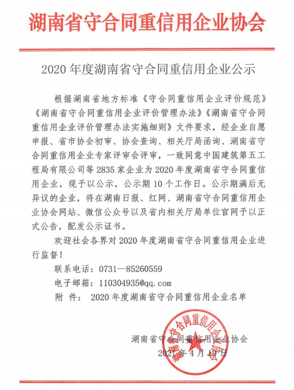 经湖南省守合同重信用企业协会评审,乐动网页版_乐动(中国)设计研究院有限公司荣获2020年度湖南省“守合同重信用企业”称号,这是设计院连续第三年获得此项荣誉。