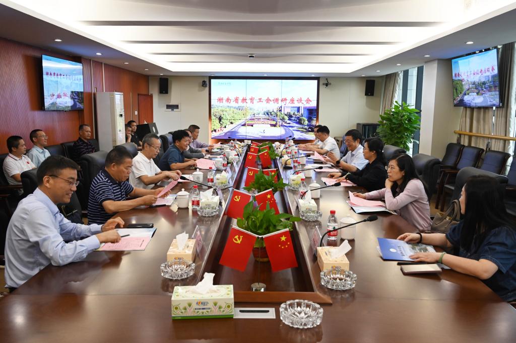 本网讯(通讯员 周敏)9月13日,湖南省总工会党组成员、省教育工会主席刘湘凌一行来校调研。学校党委书记汤放华主持座谈会,校长何振、副校长夏宏宇陪同实地调研并参加座谈会。