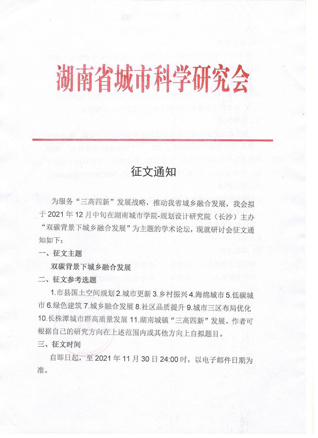 湖南省城市科学研究会2021年“双碳背景下城乡融合发展”学术论坛征文通知