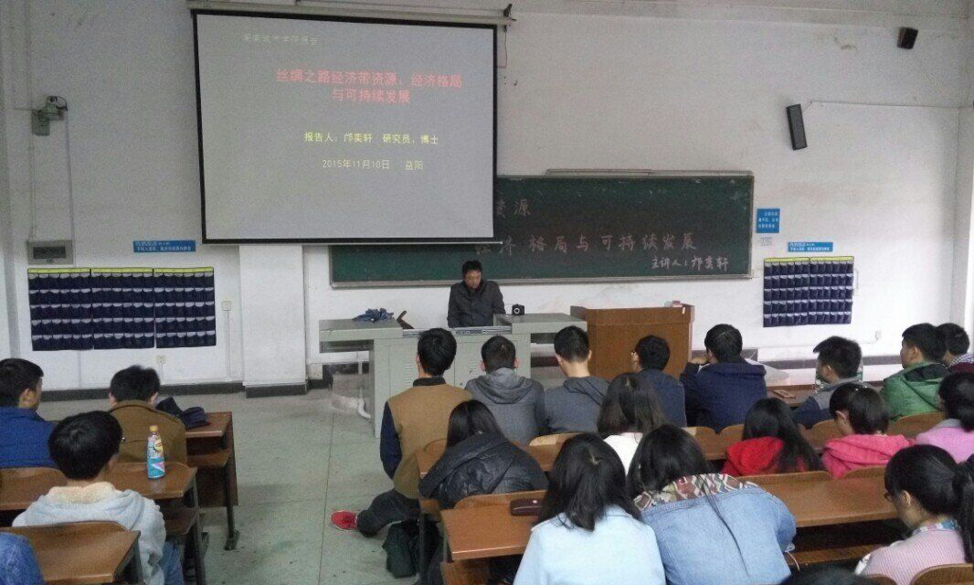 乐动网页版_乐动(中国)优秀校友、湖南省社会科学院农研中心研究员邝奕轩教授为我院新生们开展了以“丝绸之路资源、经济格局与可持续发展”为主题的报告讲座,讲座在一教105教室举行。我院刘刚老师和王方俊老师以及全体大一新生聆听了讲座。