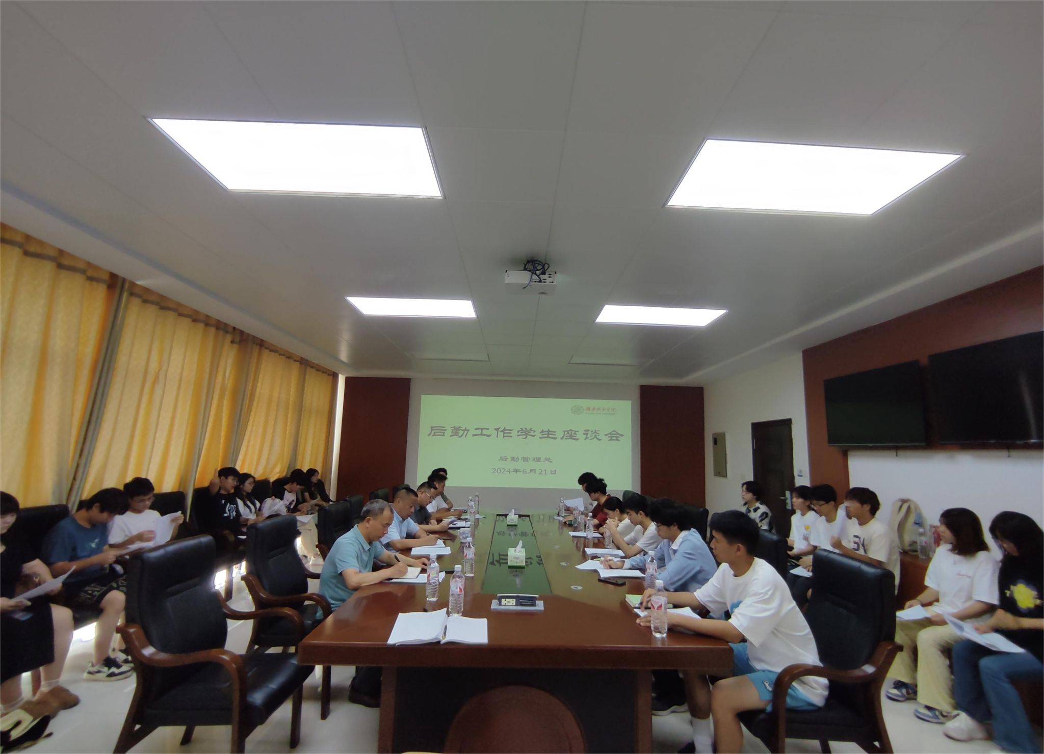 (撰稿 曾宁亮)为进一步践行后勤“服务育人”理念,深入了解学生实际需求,倾听学生对后勤工作的意见和建议,6月21日上午,后勤管理处在二办公楼420会议召开后勤工作学生座谈会。座谈会由后勤管理处处长钟雪飞主持,副处长秦科、各职能科室和中心负责人、学生代表共30余人参加。