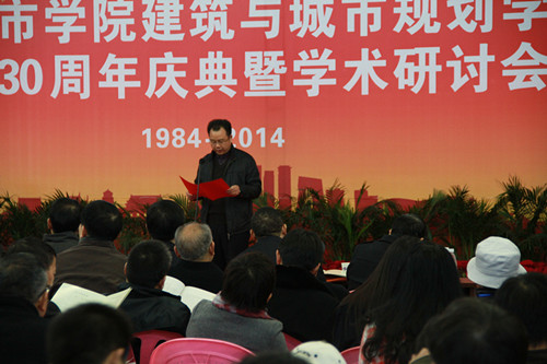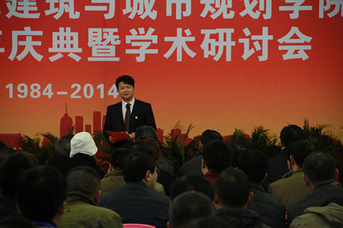 校长李建奇代表学校向建筑与城市规划学院创建30周年表示衷心地祝贺。他说建规院30年来桃李满天下,为国家现代化建设事业培养了大批规划建筑行业的栋梁之才。希望建规院面向世界,面向未来,抓住机遇,加快发展,再创辉煌。